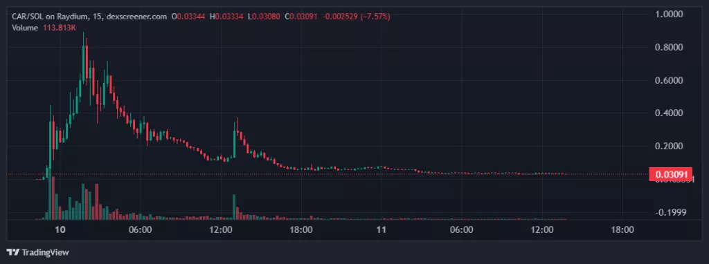 15-минутный график капитализации CAR агрегатора Raydium. Данные: DEX Screener.