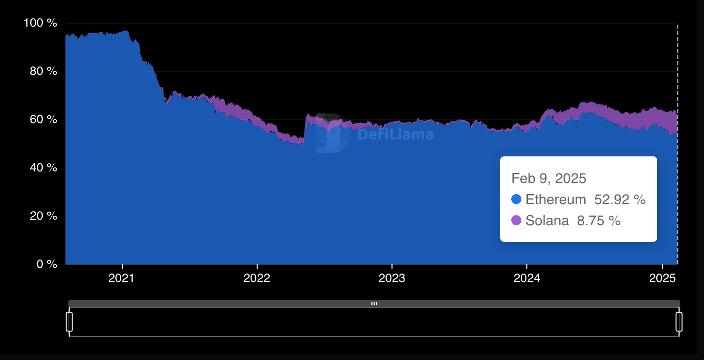 Даже с учётом решений для масштабирования Ethereum L2, которые обрабатывают значительную часть его торговой активности, позиции Solana остаются сильными, отмечает исследователь.