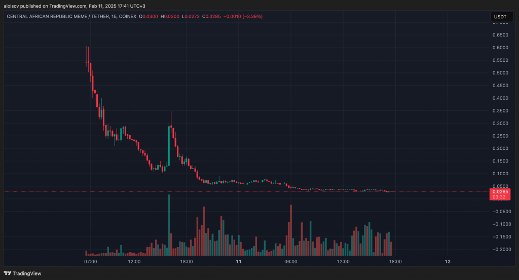 Мемкоин Центральноафриканской Республики потерял 97% стоимости менее чем за двое суток после запуска. Токен CAR, достигнув пика в $0,89, рухнул до $0,029, что привело к сокращению капитализации с $894 млн до $29 млн.