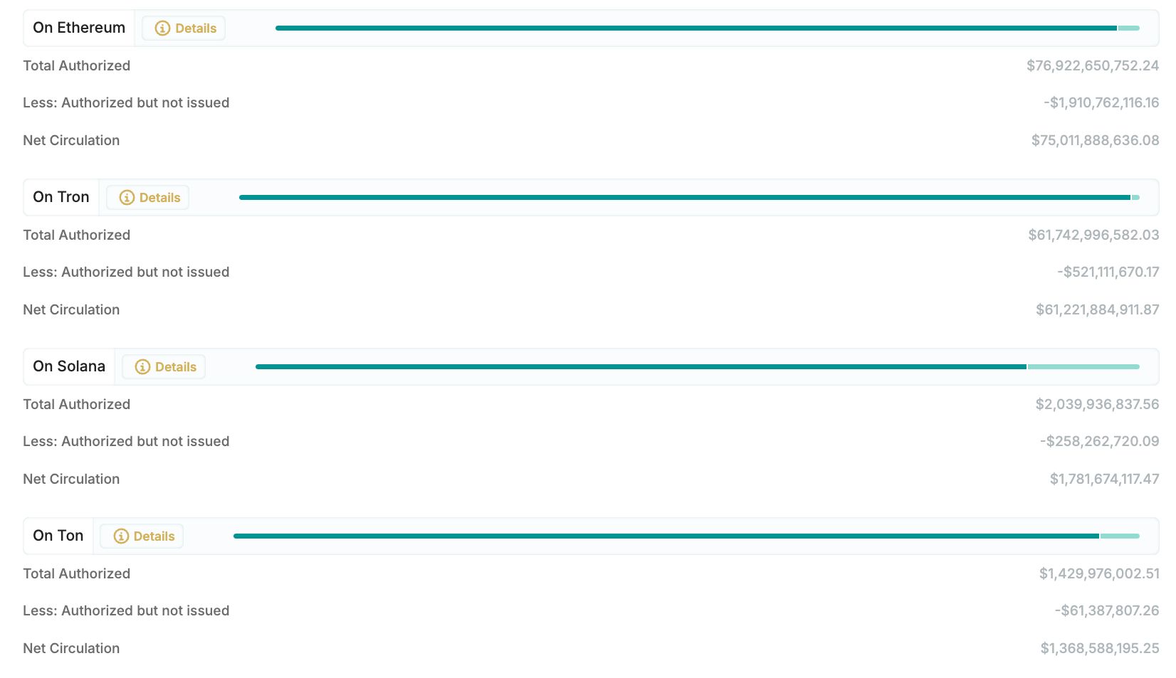 По данным Tether, предложение USDT на Ethereum и Tron составляет $136 млрд. Это 96% от общего объёма всех USDT в обороте. Третье место занимает Solana, в обороте сети около 1,8 млрд USDT. Оборот USDT в TON составляет $1,4 млрд.