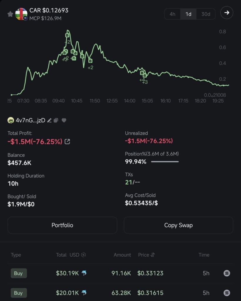 По данным аналитиков, инвестор потратил $1,9 млн на покупку 3,6 млн Central African Republic Meme (CAR). Он покупал токен, когда тот торговался вблизи исторических максимумов, а также докупал мемкоин при падении курса.