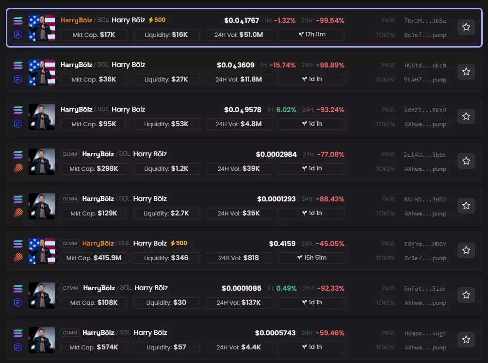 По этой же траектории последовали котировки запущенного еще 7 февраля токена HARRYBOLZ на Solana. Цена подскочила с $0,00006 до $0,025 после смены Маском ника в X. Но после возврата реального имени предпринимателем последовал обвал на ~94% — до $0,0008. Рыночная капитализация мем-коина на пике достигла $25 млн, объем торгов приблизился к $44 млн (DEX Screener).
