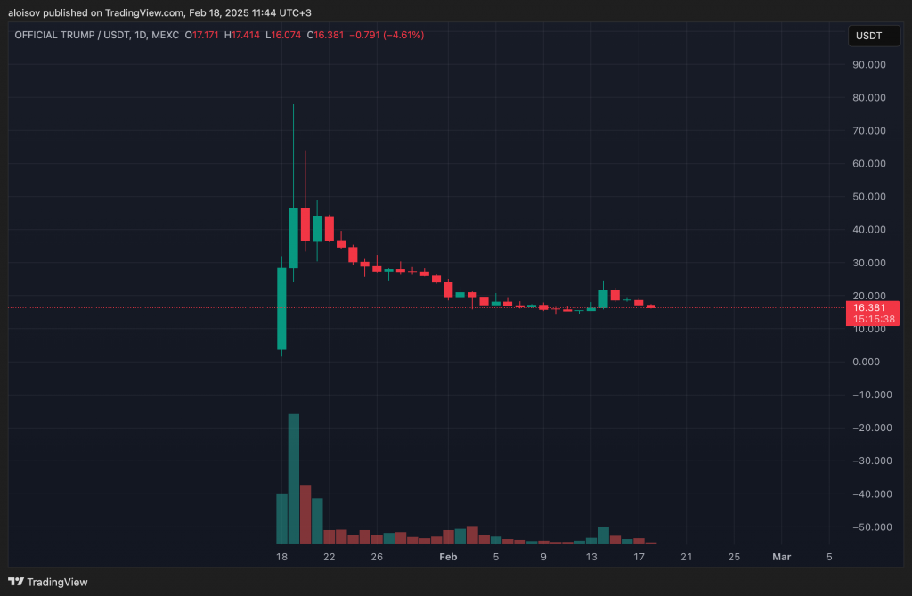 Что касается самого мемкоина $TRUMP, его судьба складывается не столь радужно. За последние сутки токен просел на 8% на фоне общего спада крипторынка. А ведь совсем недавно, буквально за несколько дней до инаугурации 20 января, этот токен стал первым мемкоином, связанным с действующим президентом США. От нескольких долларов на старте его цена взлетела до $75, а капитализация достигла $13 млрд. В этом нет ничего удивительного — харизматичный политик давно превратился в настоящий бренд, способный придать золотой блеск любому проекту.