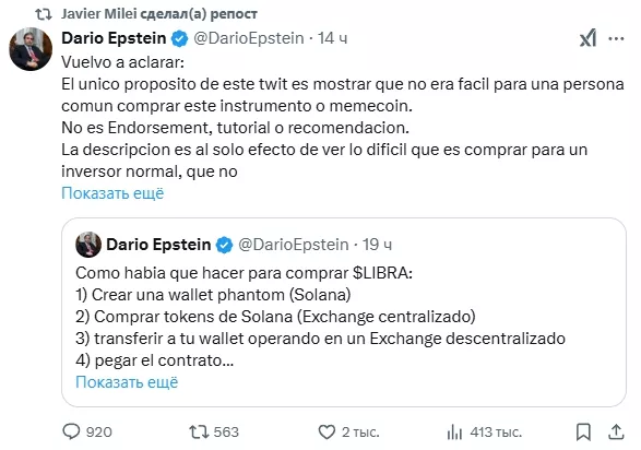 - Президент Аргентины Хавьер Милей опроверг продвижение LIBRA и тут же репостнул инструкцию по покупке токена.
