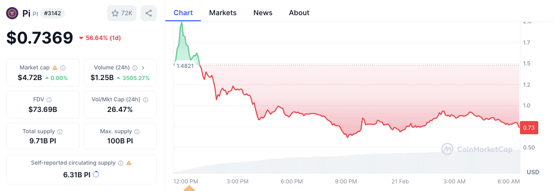 На момент написания статьи токен Pi торговался по $0,7369, снизившись на 56,64%.