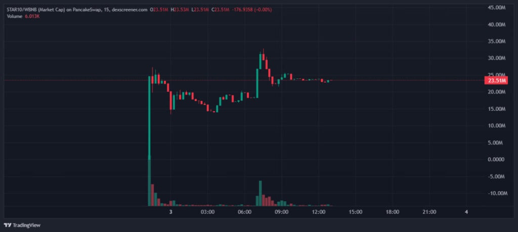 Аналитики Lookonchain отметили, что неизвестный трейдер заработал более $1,5 млн на STAR10 всего за пять минут. Он потратил 190 BNB ($118 000) для покупки 19,32 млн STAR10, а затем продал токены за 2677 BNB ($1,66 млн).