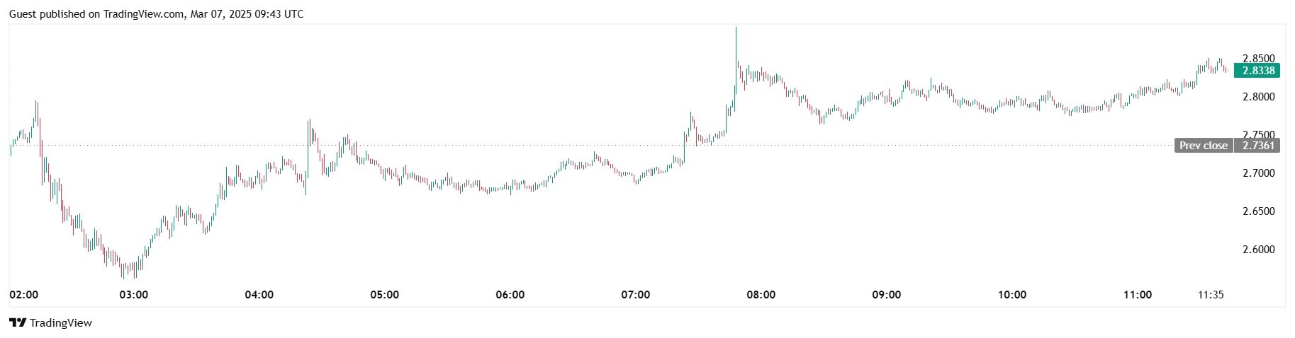 Актив отреагировал на новость о партнерстве уверенным ростом. На суточном графике он составляет 3,5%. Монета торгуется по $2,8 на момент написания: