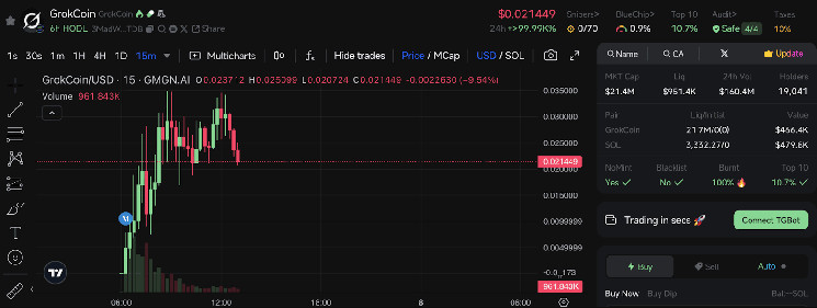 На фоне такого заявления объем торгов токеном, запущенным на блокчейне Solana, превысил $160 млн, а его рыночная капитализация составила более $21 млн на момент написания материала, согласно GMGN.
