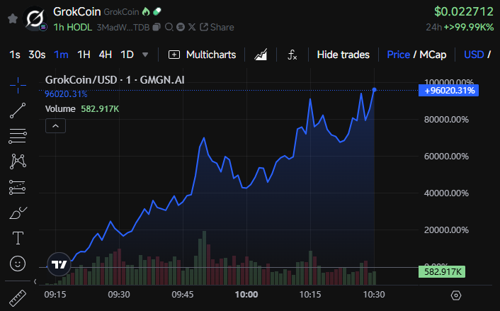 Вскоре после упоминания капитализация монеты подскочила до $12 млн, а объем торгов достиг $51,9 млрд. По данным GMGN, стоимость GrokCoin поднялась почти на 100 000%. На это обратил внимание китайский журналист Колин Ву.
