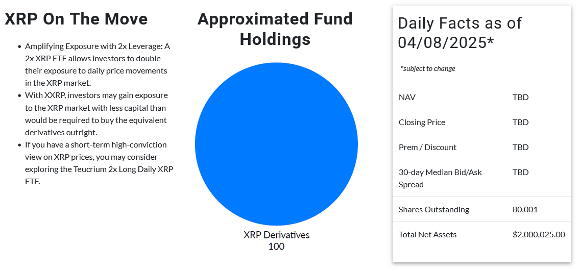 Согласно веб-сайту компании, ETF Teucrium 2x Long Daily XRP стремится предложить инвесторам в два раза большую ежедневную доходность токена XRP с комиссией за управление 1,85% и годовым коэффициентом расходов. ETF на основе XRP будет торговаться под тикером XXRP с 8 апреля.