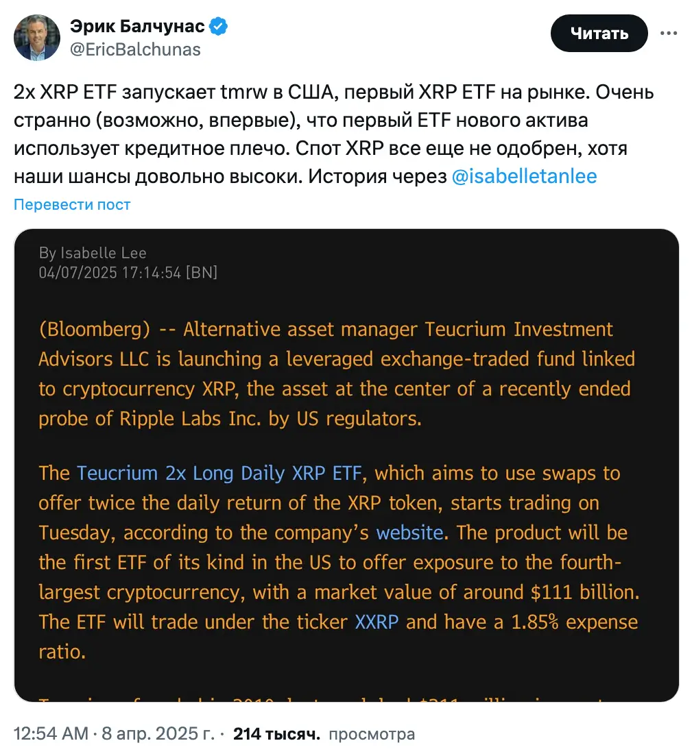 Аналитик Bloomberg ETF Эрик Балчунас сказал, что «очень странно» видеть, как первый ETF нового актива выходит в формате с кредитным плечом, однако он добавил, что шансы на одобрение спотового XRP ETF остаются «довольно высокими».