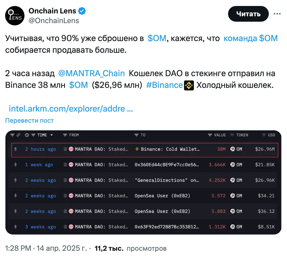 В AMA генеральный директор Mantra также сказал, что транзакция на 38 миллионов OM на холодный кошелек Binance 14 апреля связана с программой стекинга на Binance.