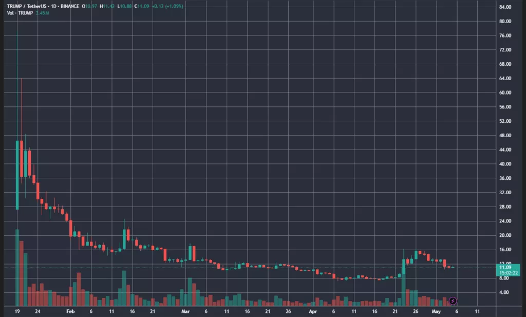 18 января — за два дня до инаугурации — Трамп объявил о запуске «официального» мем-токена на блокчейне Solana. Цена TRUMP за сутки выросла до $77, а FDV достигла $62 млрд. На момент написания монета торгуется на ~85% ниже исторического максимума.
