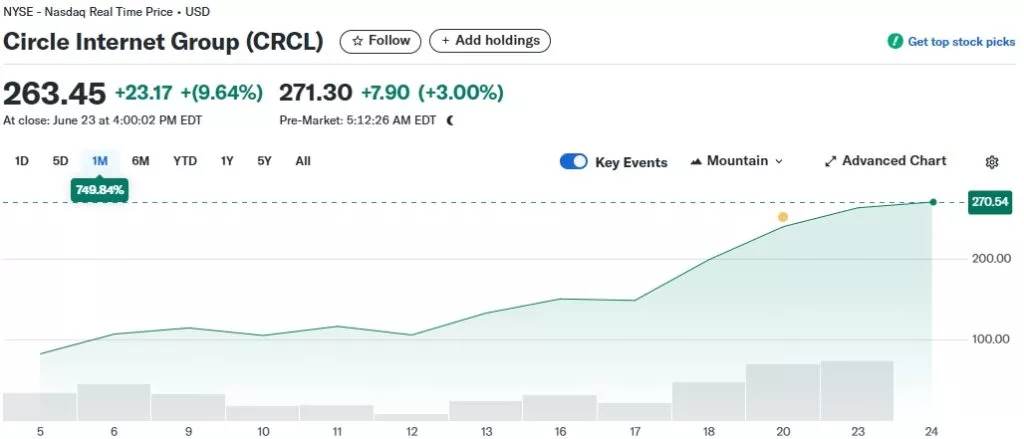 По итогам торговой сессии 23 июня капитализация Circle выросла до $63,9 млрд, превзойдя рыночное предложение своего флагманского продукта — стейблкоина USDC.