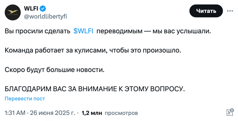 «Вы просили сделать $WLFI передаваемым — мы вас услышали», — заявили в проекте, добавив, что команда активно работает за кулисами, чтобы сделать это изменение возможным. Сообщение завершилось обещанием «скоро появятся большие новости».