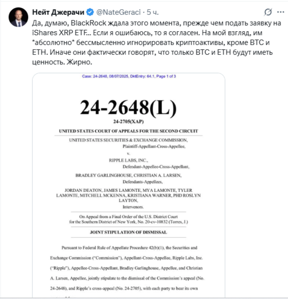Эксперт по ETF Нейт Джерачи прогнозирует потенциальную подачу заявки на ETF BlackRock XRP после официального отклонения апелляции по иску Ripple. Другие аналитики также предполагают, что крупнейший в мире управляющий активами расширит свою линейку криптоETF за пределы Bitcoin и Ethereum после этой юридической ясности.
