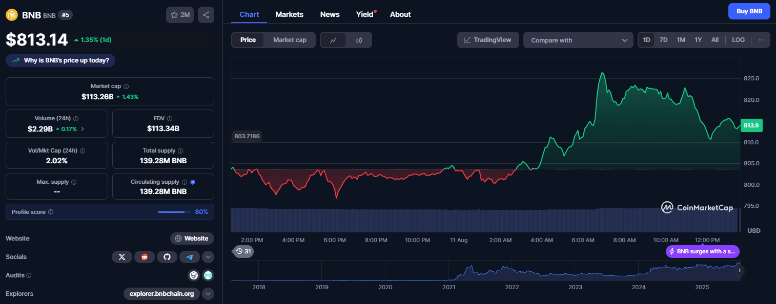 Являющийся нативным токеном блокчейна BNB Chain, упомянутый актив занимает пятое место по рыночной капитализации. По данным CoinMarketCap, за последние сутки его цена выросла на 1,35% до $813. Показатель капитализации актива составляет $113,2 млрд.