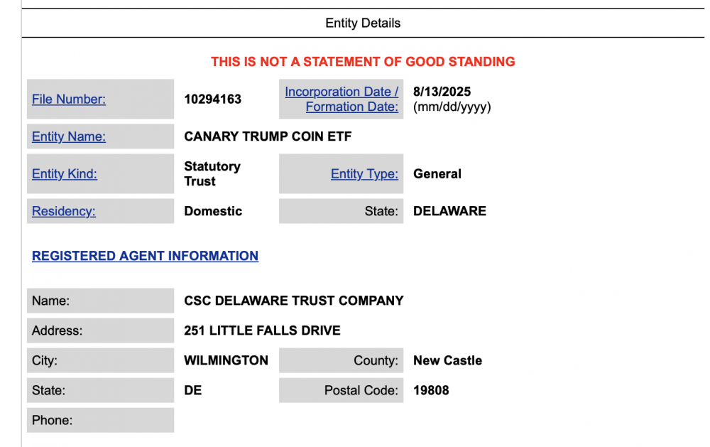 Согласно информации на сайте Государственного департамента Делавэра, компания Canary Capital в среду подала заявку на регистрацию ETF Canary Trump Coin. Регистрация предполагает запуск криптовалютного ETF, отслеживающего курс официального мемкоина Трампа TRUMP, хотя официальная подача заявки в Комиссию по ценным бумагам и биржам (SEC) может занять еще несколько месяцев.