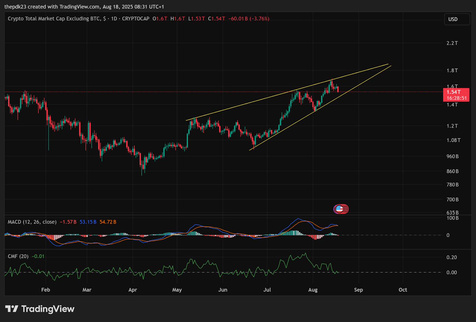 Пробой этого клина может привести к падению рыночной капитализации до $1,40 трлн, тогда как прорыв сопротивления $1,65 трлн будет сигнализировать о возобновлении силы альткоинов.