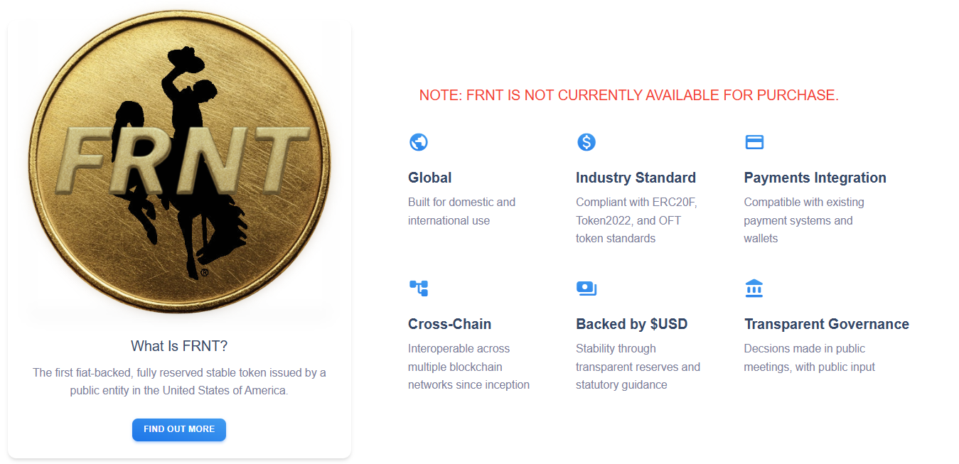 «Вайоминг стал первой публичной госструктурой в США, выпустившей стейблкоин на базе блокчейна. FRNT разработан для обеспечения безопасных, прозрачных и эффективных цифровых транзакций для частных лиц, компаний и организаций по всему миру», — говорится в анонсе.