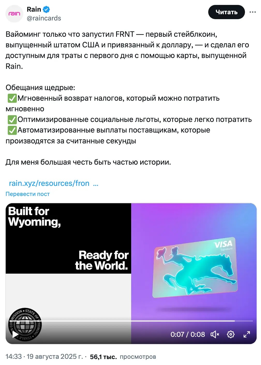 Согласно объявлению, опубликованному разработчиком Avalanche — компанией Ava Labs, — стейблкоин Вайоминга FRNT будет доступен для использования везде, где принимается Visa.