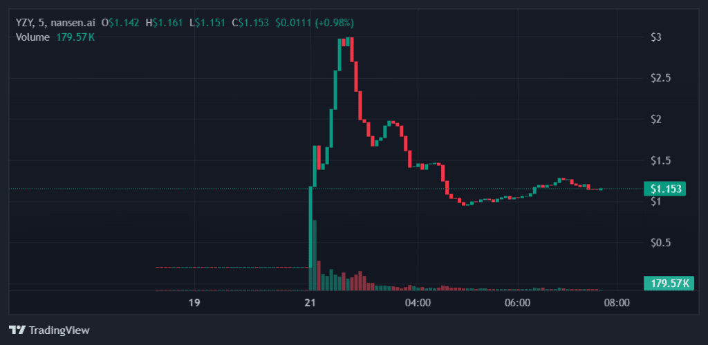 После презентации курс YZY в моменте достиг отметки в $2,99. Капитализация актива превысила $3 млрд, согласно данным платформы Nansen. Однако позднее показатели мемкоина быстро упали: