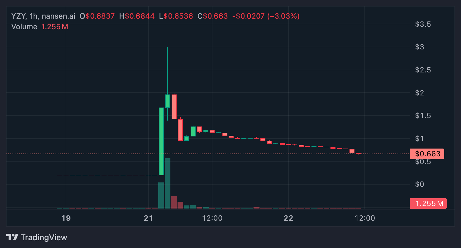Вчера Канье Уэст (Kanye West) запустил мемкоин YZY, и результат оказался катастрофическим для розничных инвесторов. Всего за час цена взлетела на 1 400%, достигнув пика в $3, а затем рухнула на 74% до $0,77. Но самое интересное — кто на этом заработал.
