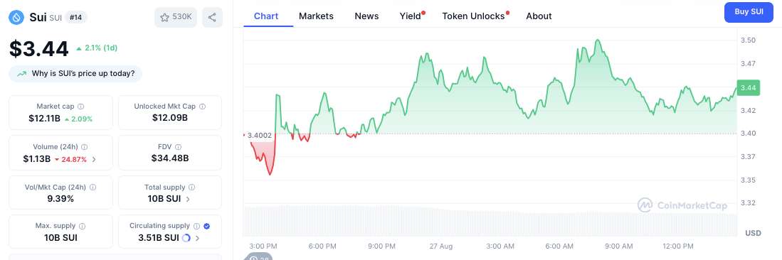 После объявления цена Sui (SUI) выросла на 2,1% за последние 24 часа, достигнув $3,44. Рыночная капитализация токена достигла $12,11 млрд, а общее количество токенов в обращении составило 3,51 млрд.