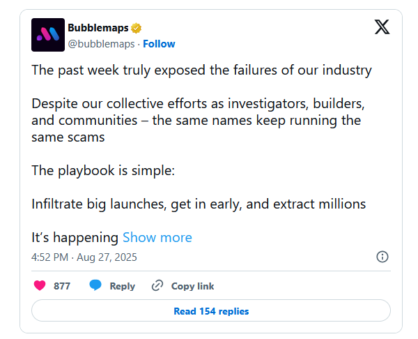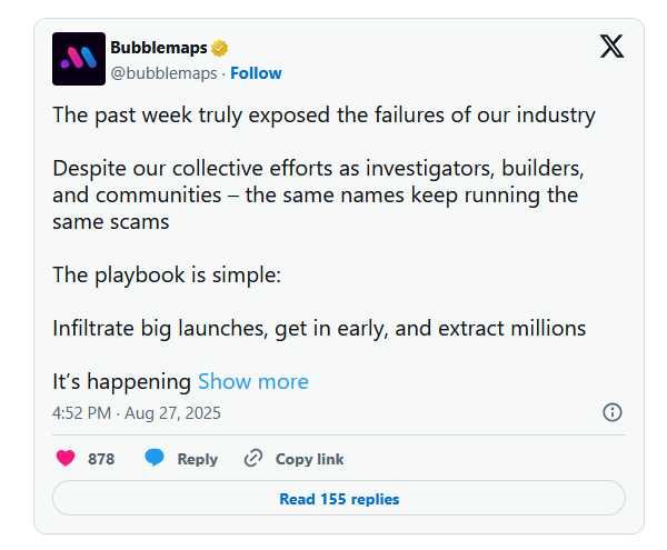 Эксперты связывают крах токена с инсайдерскими схемами и агрессивной торговлей ботов. Bubblemaps утверждает, что 94% первоначального предложения находилось под контролем инсайдеров, а структура комиссий делала сделки крайне невыгодными. По оценкам аналитиков, торговые издержки для участников достигали около 10% за полный цикл.