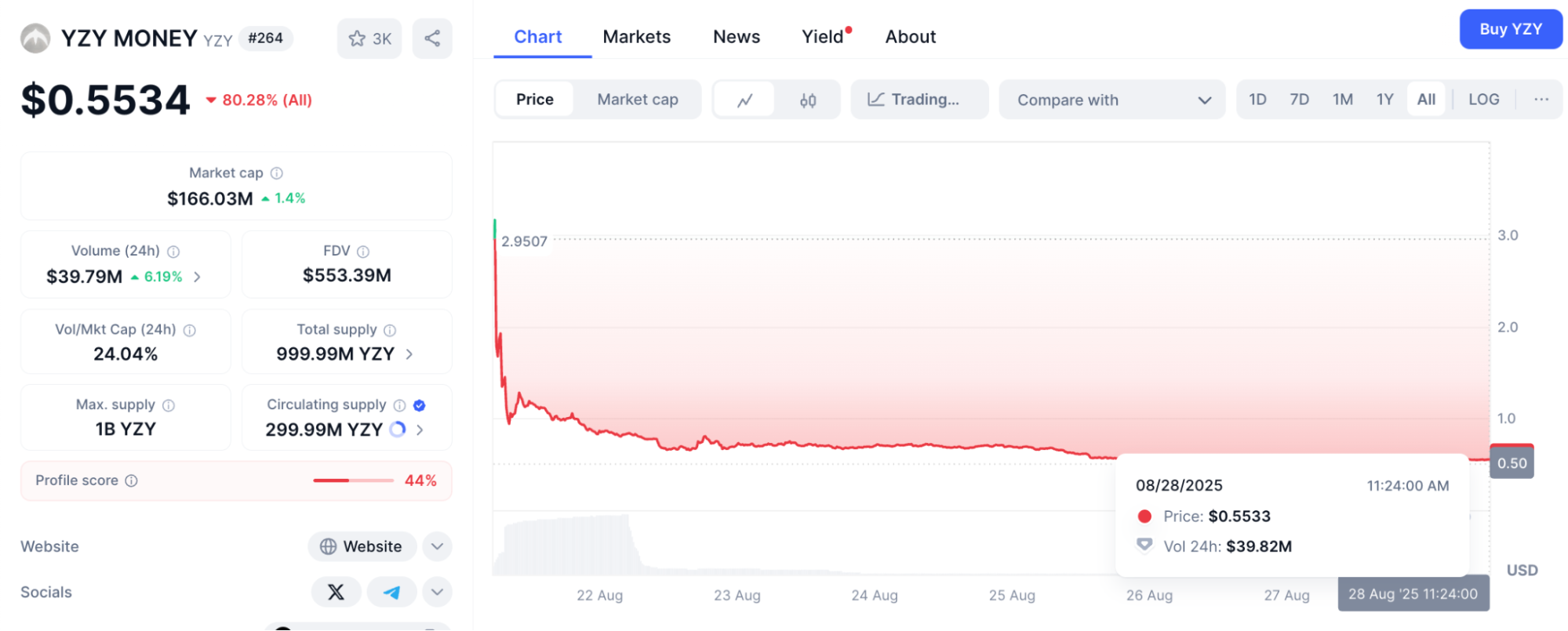 YZY был представлен на блокчейне Solana в конце августа и быстро набрал популярность, достигнув капитализации свыше 3 млрд долларов. Однако уже через несколько часов цена обвалилась более чем на 90%.