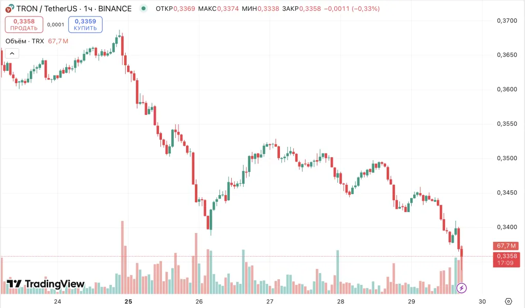 TRX — нативный токен экосистемы, использующийся для оплаты комиссий — не отреагировал на новость. За последние сутки его цена опустилась на 3,6%.