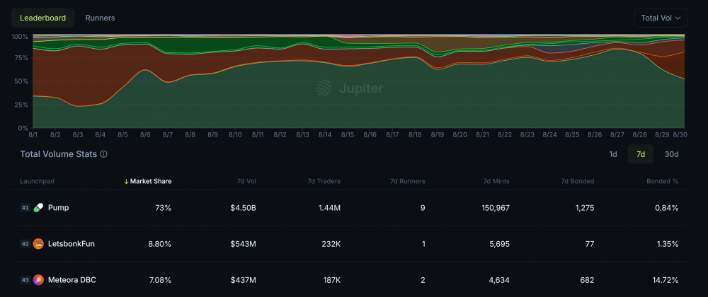 Согласно данным агрегатора децентрализованных бирж Solana (DEX) Jupiter, доминирование LetsBonk продолжалось в течение всего июля, когда платформа многократно увеличивала свою рыночную долю по сравнению с Pump.fun.