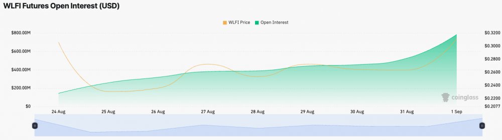 Открытый интерес по акциям WLFI (зеленый) по сравнению с их ценой (желтый) за последнюю неделю. Источник: CoinGlass.