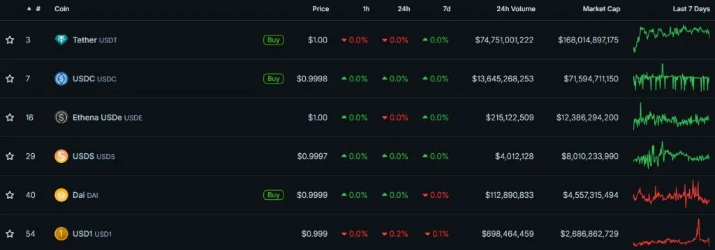 Текущий объем рынка «стабильных монет» составляет почти $287 млрд. Доминируют USDT от Tether с объемом предложения в $168 млрд и USDC от Circle с $71,5 млрд. Суммарно на два токена приходится ~83% от общего показателя.
