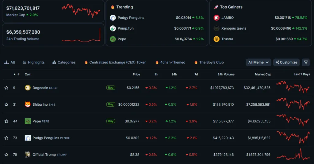 На момент написания рыночная капитализация сектора составляет $71,62 млрд. Лидирует Dogecoin с показателем в $32,46 млрд.