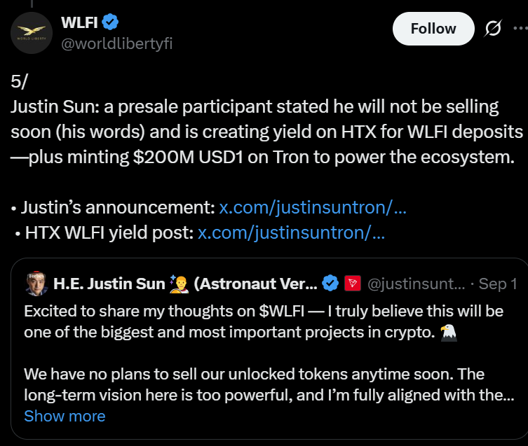 «Мы не планируем продавать наши разблокированные токены в ближайшее время, — заявил тогда Сан, один из первых участников предпродажи токена WLFI. — Долгосрочное видение здесь слишком сильное, и я полностью разделяю эту миссию».