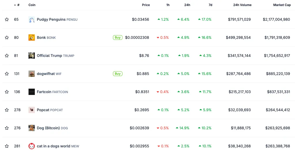 Ведущие «смешные» токены в экосистеме показали двузначный рост за прошедшие сутки. Большая часть из них подорожала на 15-30% от локальных минимумов.