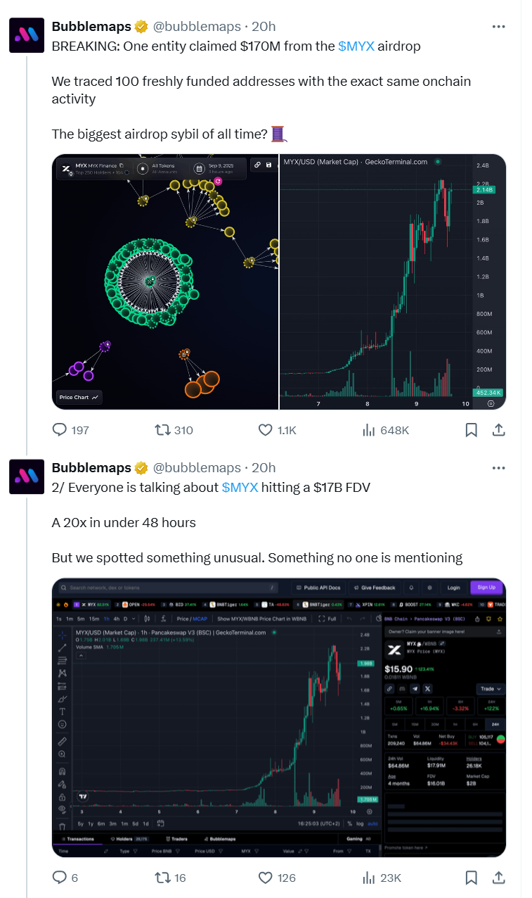 Блокчейн-аналитическая компания Bubblemaps сообщила о возможной, по её словам, крупнейшей атаке Сивиллы в истории криптовалют, выявив около 100 недавно пополненных кошельков, которые забрали 9,8 млн токенов MYX на сумму $170 млн, полученных в ходе недавнего аирдропа.