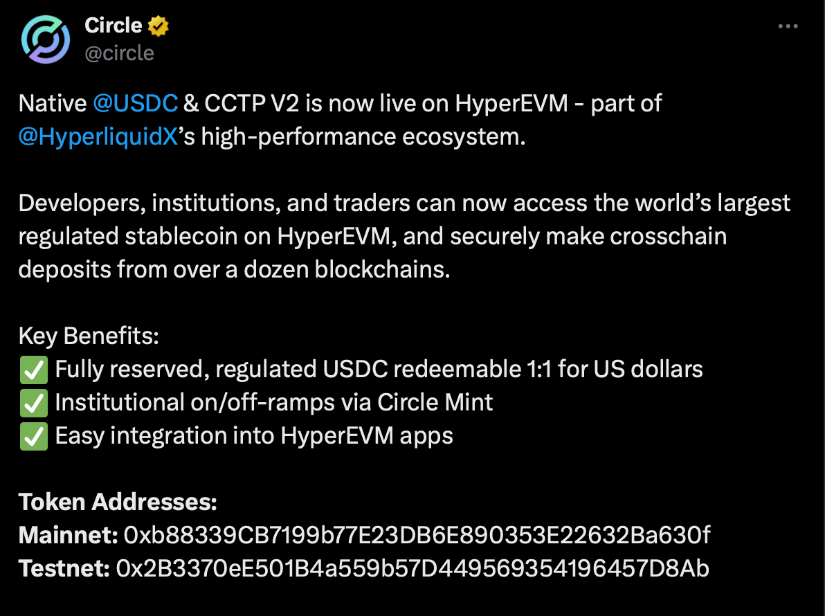 «Этот запуск - первый шаг к возможности внесения USDC на спотовую и бессрочную биржу Hyperliquid на HyperCore», - сообщает Circle в X.
