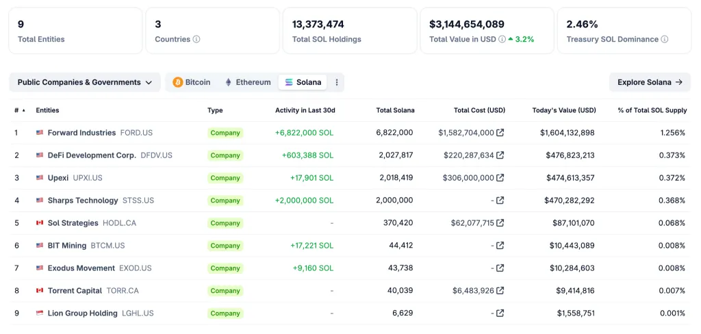Forward Industries — крупнейший держателем Solana среди корпоративных казначейств. Фирмы с фокусом на актив преодолели порог в 1 млн SOL под управлением.