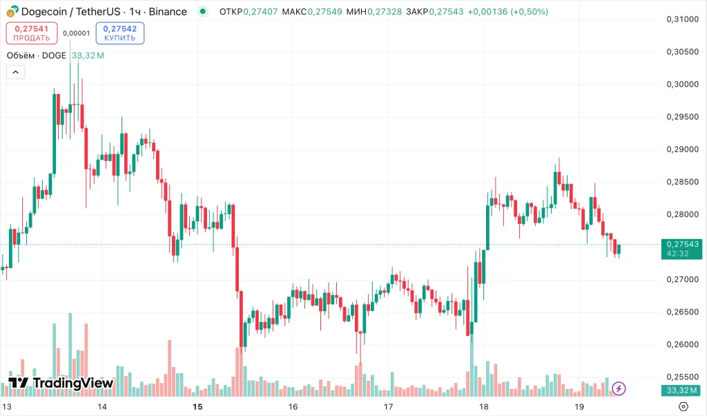 Котировки активов не отреагировали на успех новых ETF. Курс мем-коина опустился на 1,6% за последние сутки. На момент написания токен торгуется по $0,27.