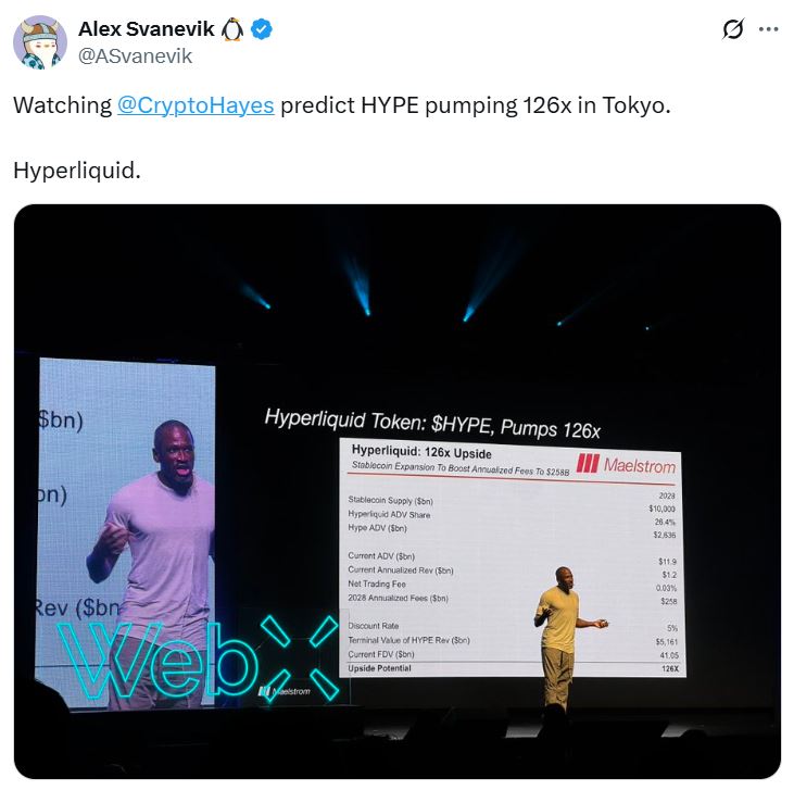 Во время конференции WebX 2025 в Токио Хейс спрогнозировал, что цена HYPE вырастет в 126 раз в течение следующих трёх лет.