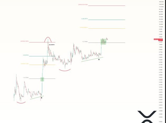 Маркс объяснил, что крупные ценовые движения обычно происходят после массивных накоплений и ценовых моделей, подобных тем, что наблюдались в прошлом. Его график сравнил текущий прорыв с предыдущими долгосрочными колебаниями, когда XRP росла после того, как оставалась на месте.