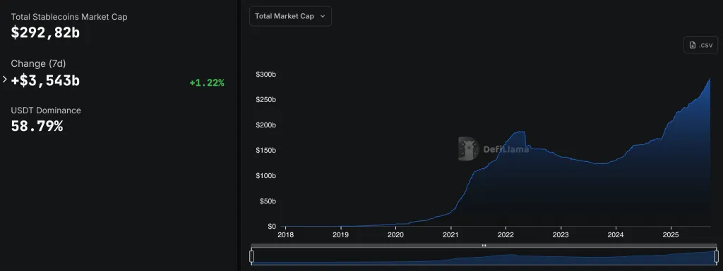 21 сентября капитализация сектора стейблкоинов впервые превысила $292,8 млрд.