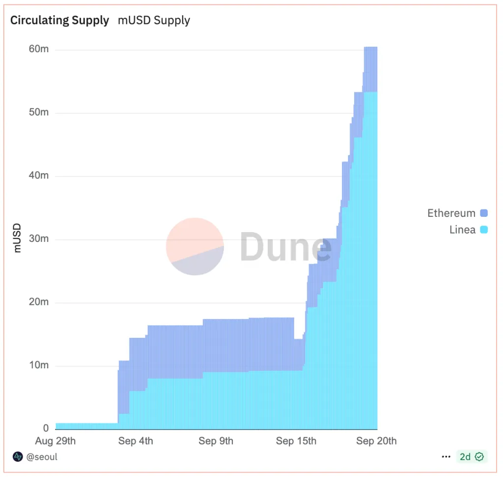 Большая часть эмиссии «стабильной монеты» находится в сети Linea — 88,2%. Оставшиеся 11,8% размещены в Ethereum.