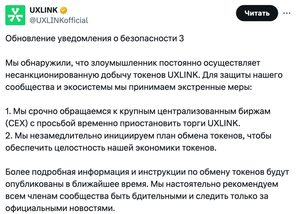 В ответ на несанкционированный выпуск токенов UXLink публично обратилась к централизованным биржам (CEX) с просьбой временно приостановить торговлю своими токенами. Компания также заявила, что инициирует план обмена токенов для защиты своей экосистемы.