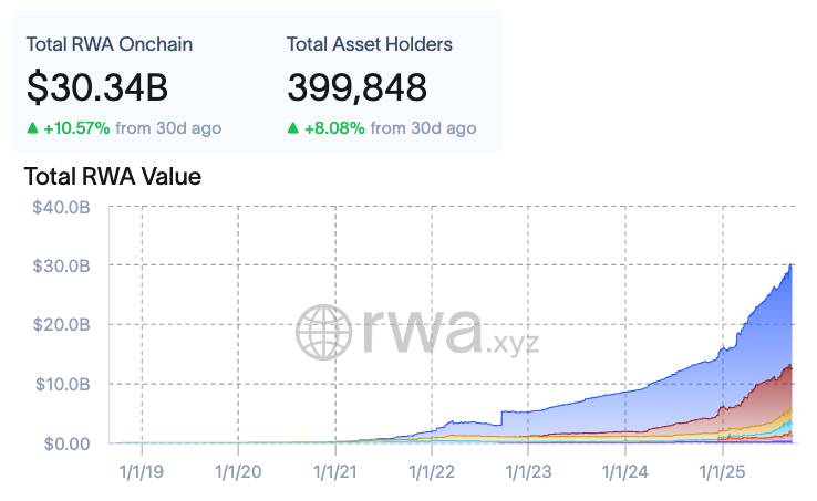 Общий объем активов, финансируемых за счет RWA, оценивается в $30,3 млрд. Источник: RWA.xyz