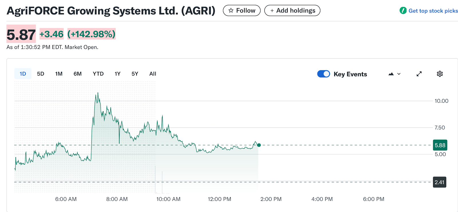 Рисунок 2. Внутридневные показатели AgriFORCE. Источник: Yahoo Finance.