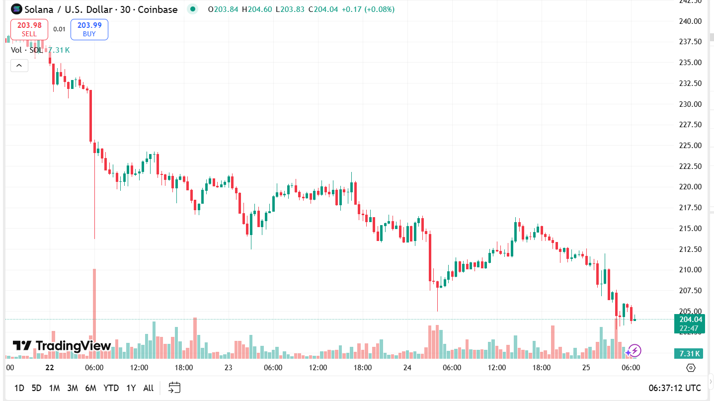 С технической точки зрения, Solana недавно закрылась ниже зоны сопротивления $215–$216, протестировав поддержку в районе $190–$200.