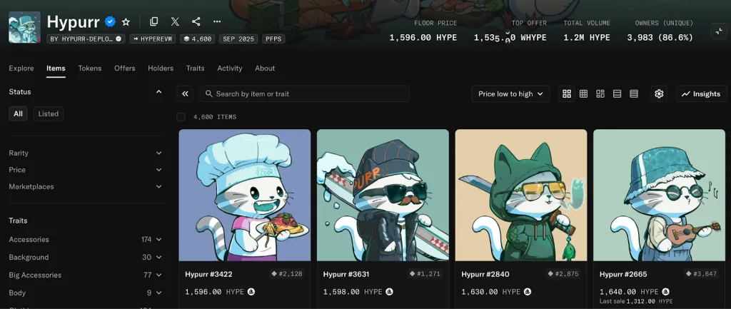 На момент написания базовая цена одного NFT составляет 1596 HYPE (~$74 900 по текущему курсу). С момента запуска объем торгов превысил 1,2 млн HYPE (~$56 млн).